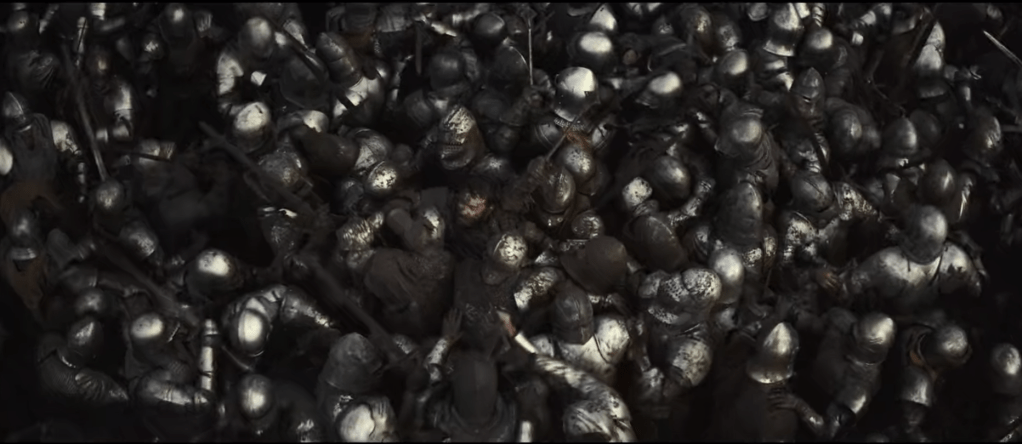 L’occhio riprende a guardare lo schermo soltanto nei due momenti bellici del film: il duello di Hal con Percy (schermisticamente parlando non perfetto ma credibile e molto meglio di centinaia di altri duelli irrealistici ai quali Hollywood ci ha abituato) e la famosa battaglia di Azincourt, considerata la vittoria inglese più sfavillante della Guerra dei Cent’anni assieme a Crecy e Poitiers. Un po’ troppo evidente la somiglianza con la Battaglia dei Bastardi del Trono di Spade: c’è persino la stessa inquadratura dall’alto.